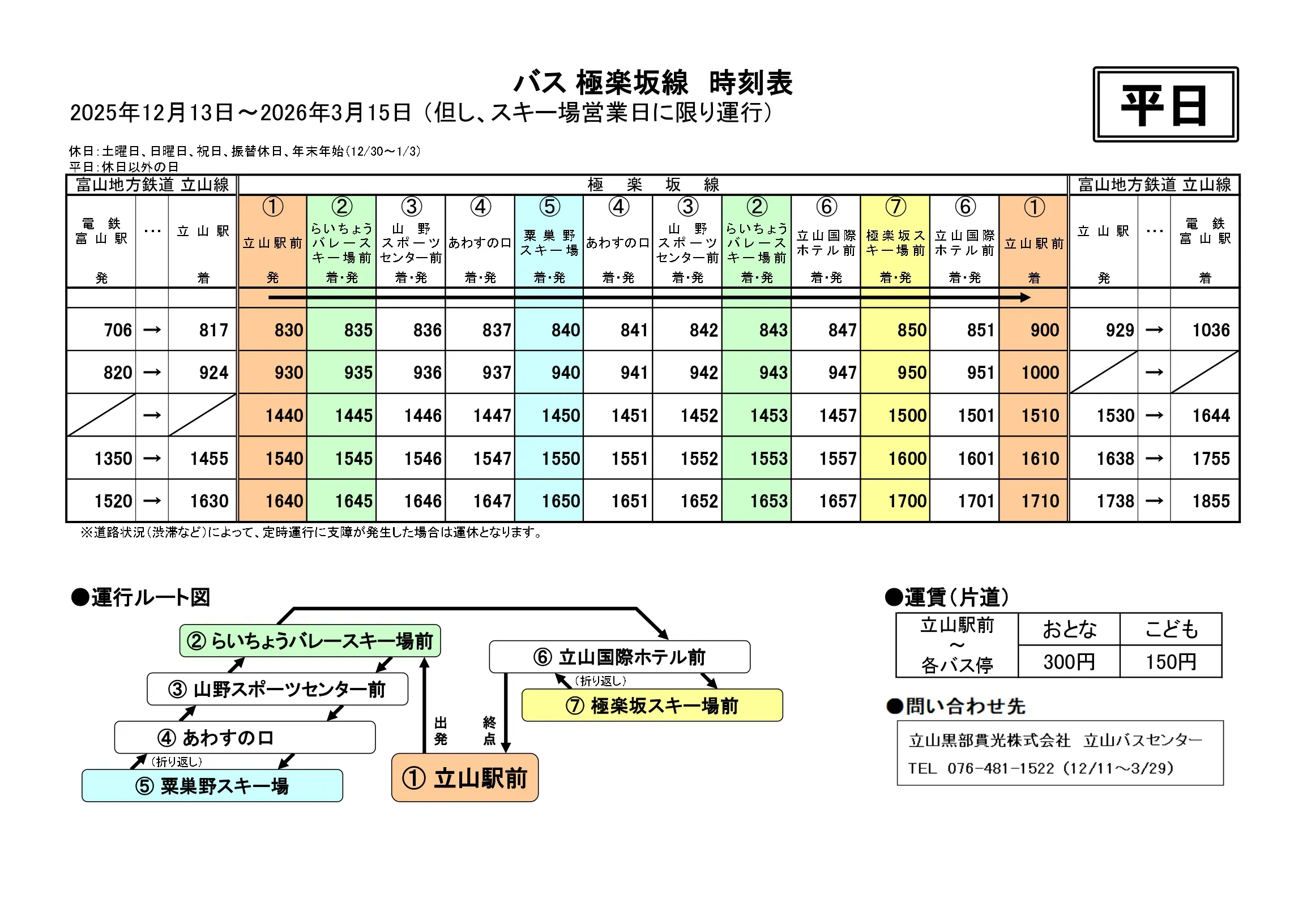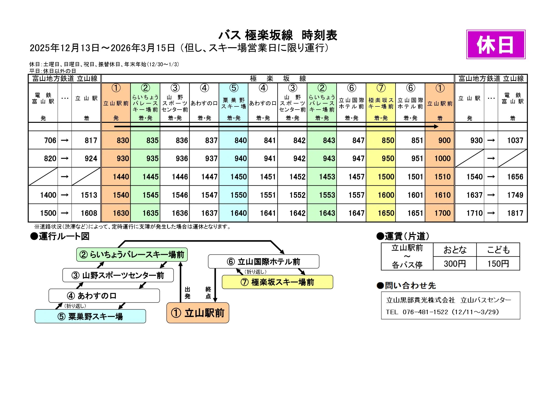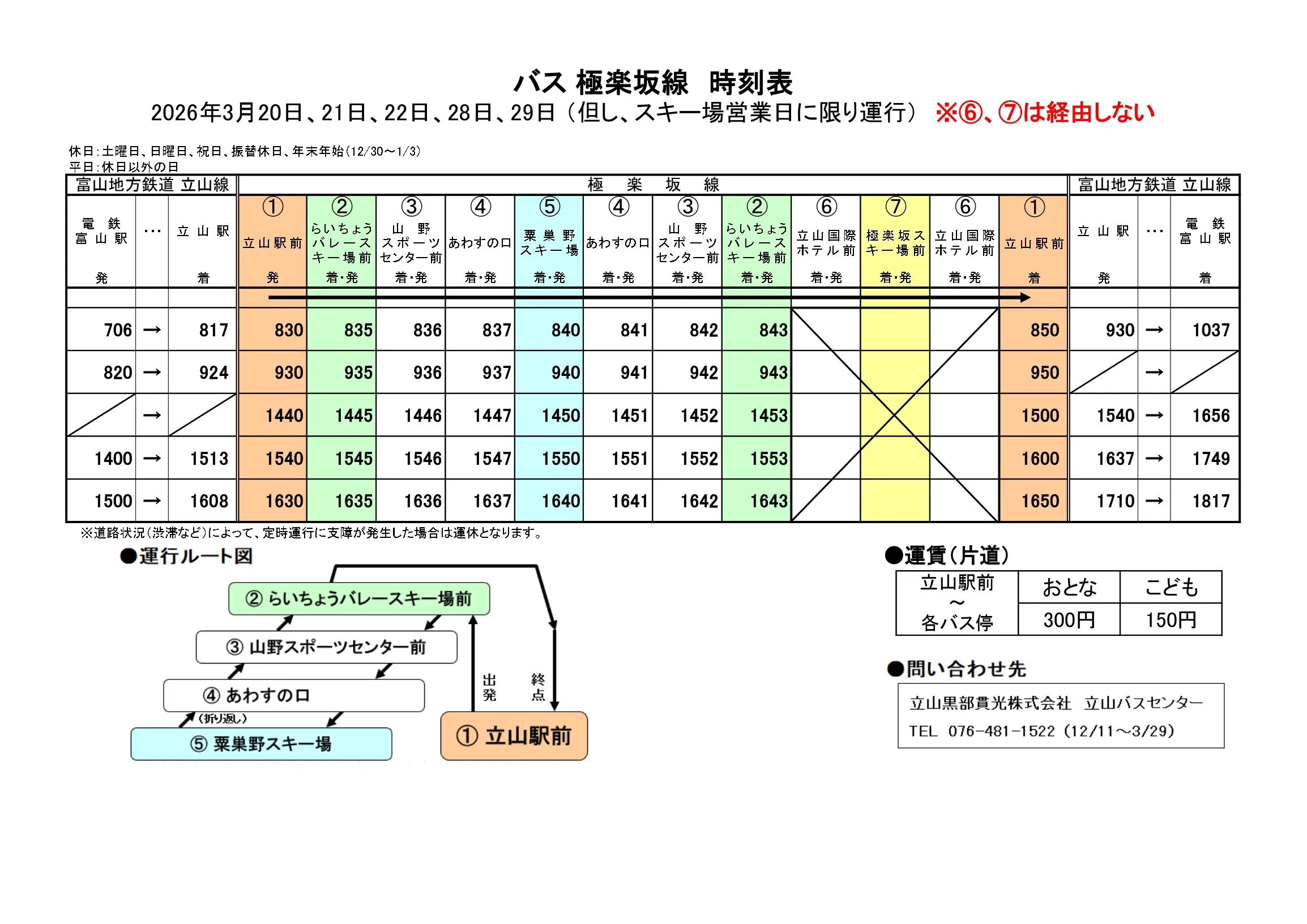 地鉄電車発着に合わせて「立山駅〜あわすのスキー場」間で連絡バスが運行されています。スキー場営業日に限り運行