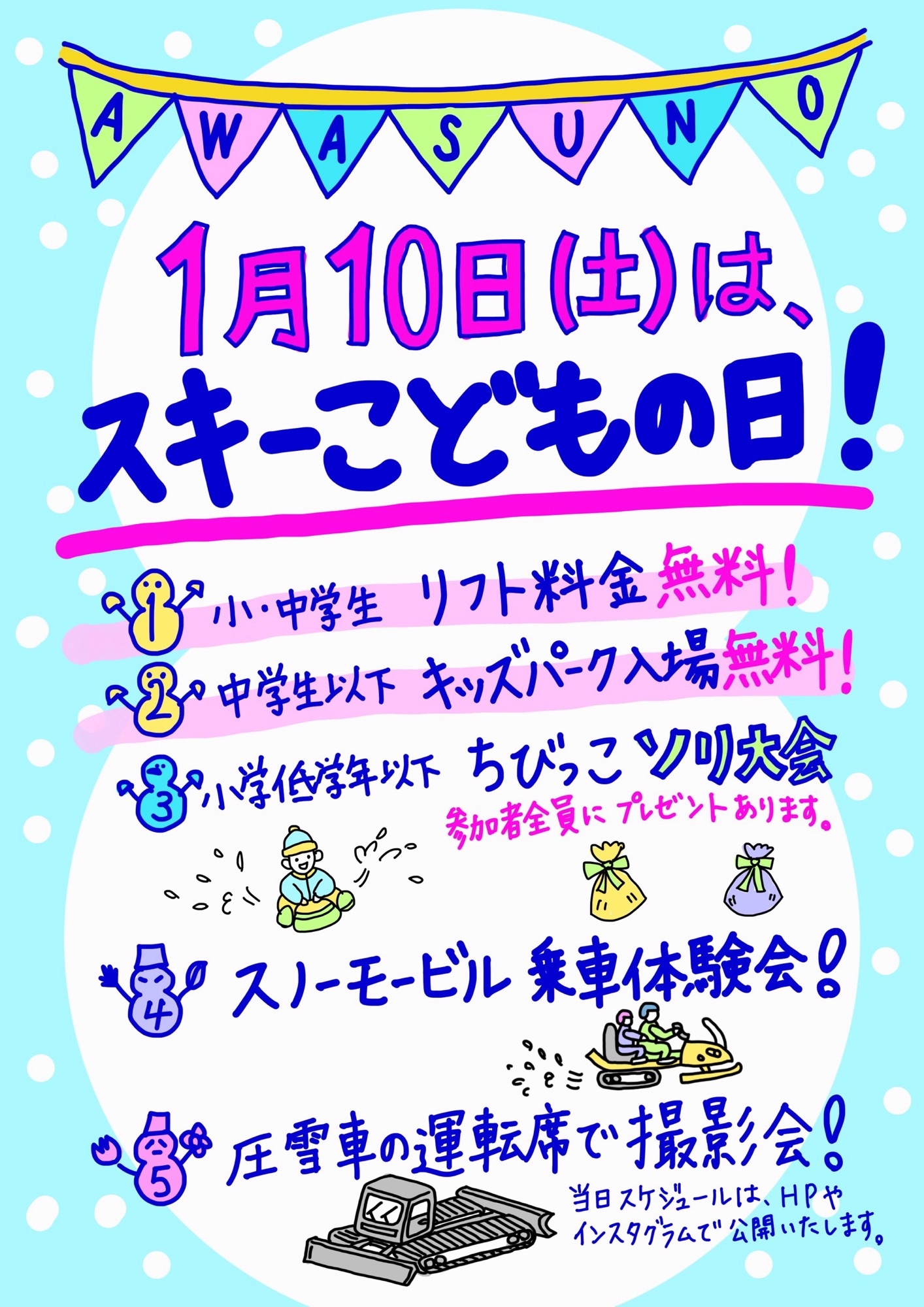 2026.01.08 新着情報 1月10日土曜日はスキー子供の日 当日は混雑が予想されます。車は乗り合いで駐車スペースの確保にご協力ください。また、電車とパスをご利用されますと大人は非常にお得なあわすの⭐︎地鉄セットクーポンをご利用ください。 前の記事へ 次の記事へ 一覧へ戻る