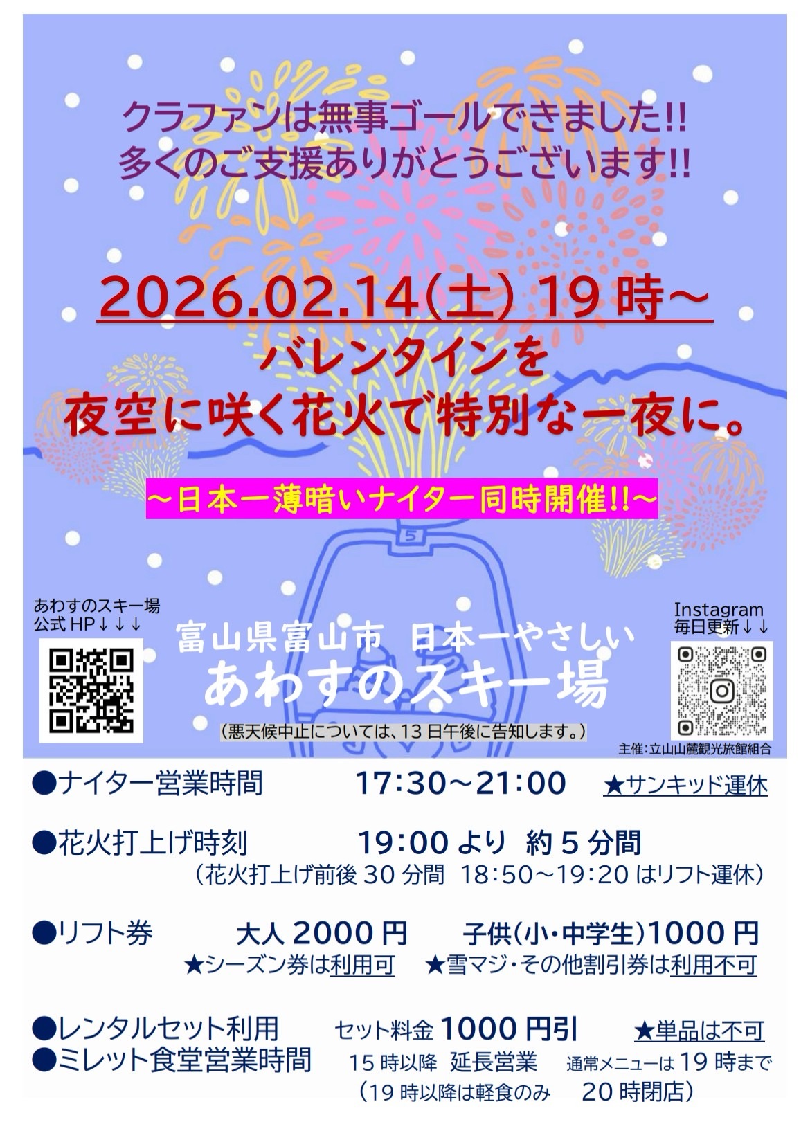 2026.02.13 新着情報 明日14日の営業について 今日は今シーズン最後の小学校団体スキー教室が開催されました。天候にも恵まれ終始児童たちの元気な声が響いていました。いつものスクールメンバーによる送迎、達成感と寂しさが交錯しておりました。来シーズンも児童たちの笑顔の為に頑張ります。さて、いよいよ明日薄暗いナイターと花火イベントです。改めて下記の要領で開催いたしますので是非お越しくださいませ♪「撮影時刻13日17:00」 前の記事へ 一覧へ戻る