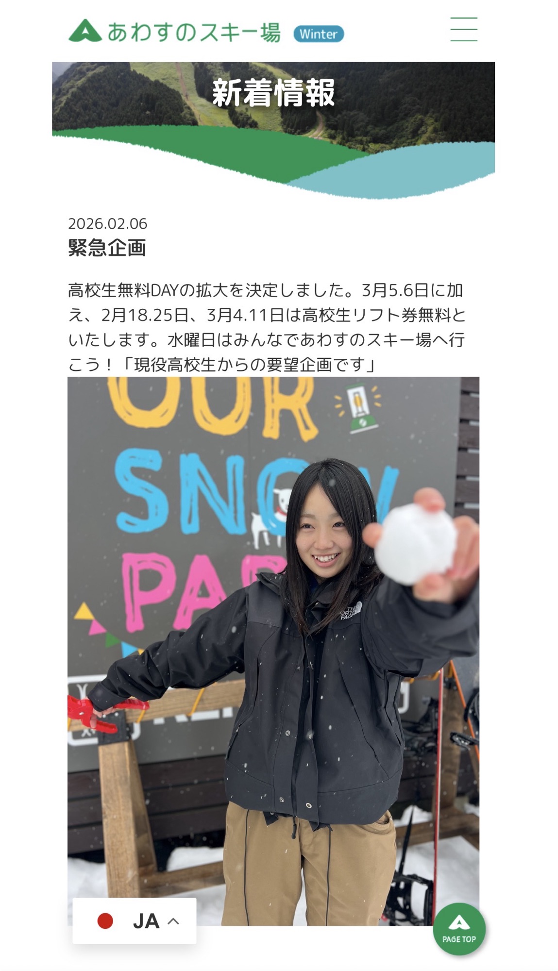 2026.02.17 新着情報 明日18日の営業について 今日もお客様と楽しく過ごすことができました。ワンワンパラダイス🐶リフトに乗らなくてもソリ遊びやお散歩日和でした。わんちゃんのチケット利用は4枚、懸命にゲレンデを走る姿が可愛らしい😊今日はスノーモービルツアーもエントリーがありました。気になる方は公式SNSをご覧ください。明日は高校生チケット無料です。明日も9時オープンです。 前の記事へ 一覧へ戻る